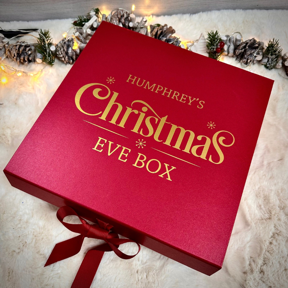 Create magical memories with our personalised Christmas Eve box, a beautiful and festive gift box designed to make the night before Christmas extra special. Crafted with care, this large 30x30x9cm box comes in a striking combination of red, gold, and white, adorned with a luxurious ribbon, perfect for holding all your Christmas Eve surprises.