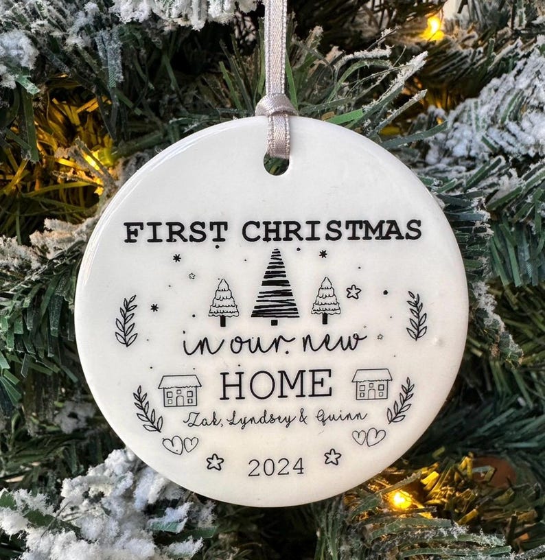 The ornament comes ready to hang with a beautiful ribbon, making it easy to add to your tree or use as a decorative piece around your home. Create lasting memories this holiday season with a personalised decoration that celebrates your first Christmas in your new home—an unforgettable keepsake that will be cherished for years to come.
