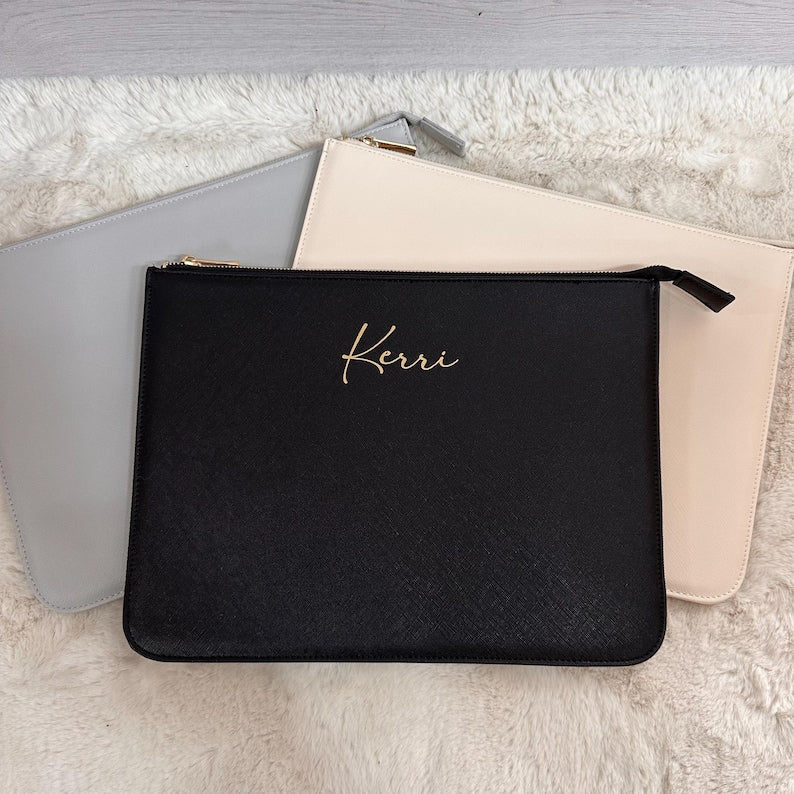 The sleeve features a secure closure and a snug fit to ensure your laptop or documents stay in place. With its sophisticated faux leather finish, it’s an elegant accessory that complements any business or casual style. The sleeve can also be personalised with your name, initials, or company logo, adding a touch of individuality and making it a thoughtful gift for colleagues, friends, or family.