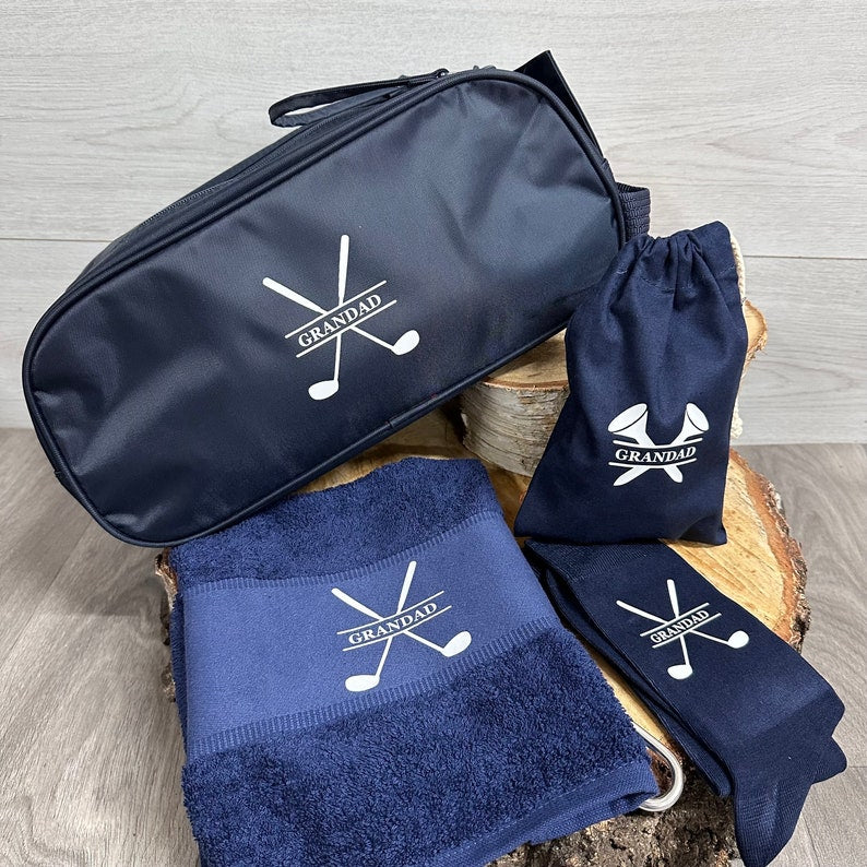 Crafted from premium materials, each item in this set is designed for durability and functionality. The Personalised Golf Towel is soft, absorbent, and perfect for keeping clubs clean during play. The Golf Shoe Bag provides a stylish and practical way to store and transport golf shoes, keeping them protected from dirt and wear. The Golf Tee Bag offers convenient storage for tees and small accessories, while the Golf Socks ensure all-day comfort on the course.