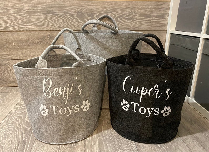 Keep your furry friend's toys neatly organized with our Personalised Pet Toy Basket. Made from durable grey felt, this customised storage trug is both stylish and functional. Featuring a charming paw print design, the basket is ideal for holding all your pet’s toys, treats, and accessories. Its lightweight yet sturdy construction allows for easy portability, making it perfect for any room in your home.