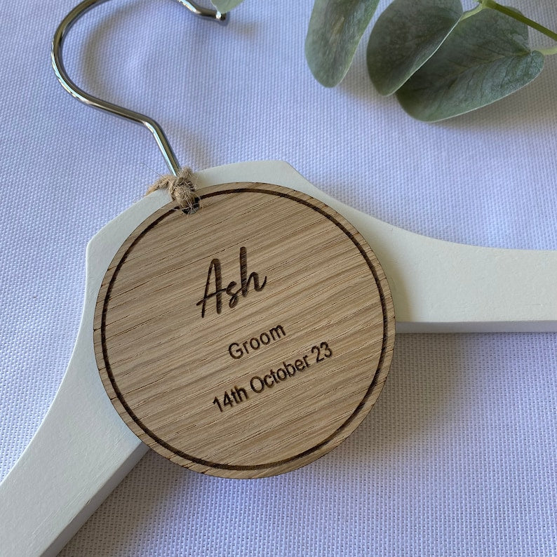 Crafted from high-quality wood, each hanger tag is meticulously personalised with names, titles, or special dates, adding a sentimental touch that sets it apart. Whether you’re looking for a tag for the bride’s gown, the groom’s suit, or for the entire wedding party, this versatile accessory is perfect for showcasing individual styles and creating a coordinated look.